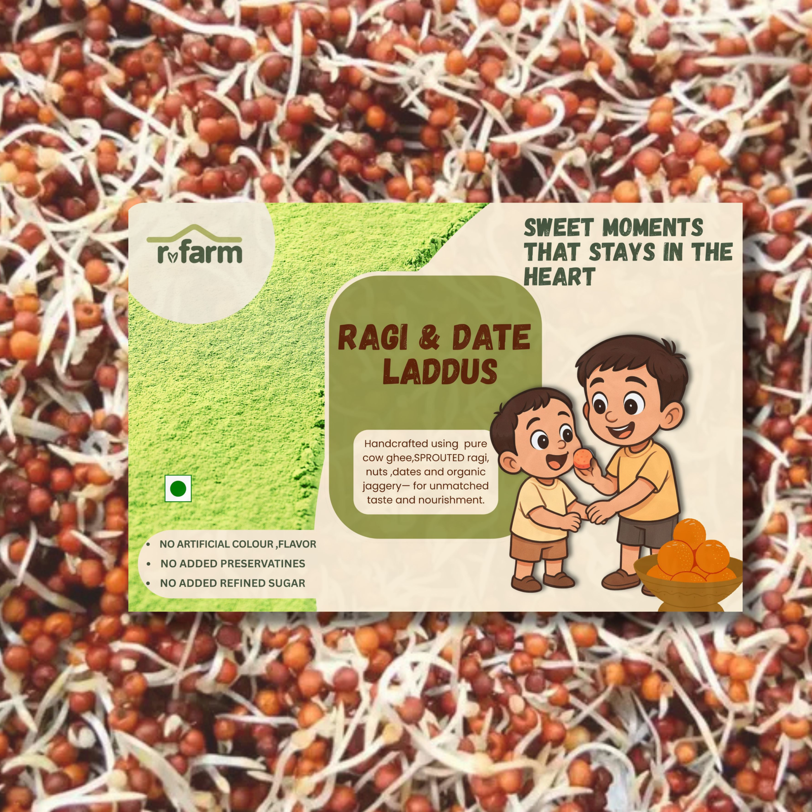 RVFarm Ragi Date Laddu – Healthy Sugar-Free Millet Energy Balls are lovingly prepared using farm-sourced ragi and naturally sweet dates, following traditional methods that preserve real nutrition. Free from refined sugar, preservatives, and chemicals, these wholesome laddus deliver pure energy and honest taste—making them a nourishing choice for growing children, active adults, and health-conscious families who trust RVFarm for clean, natural food.