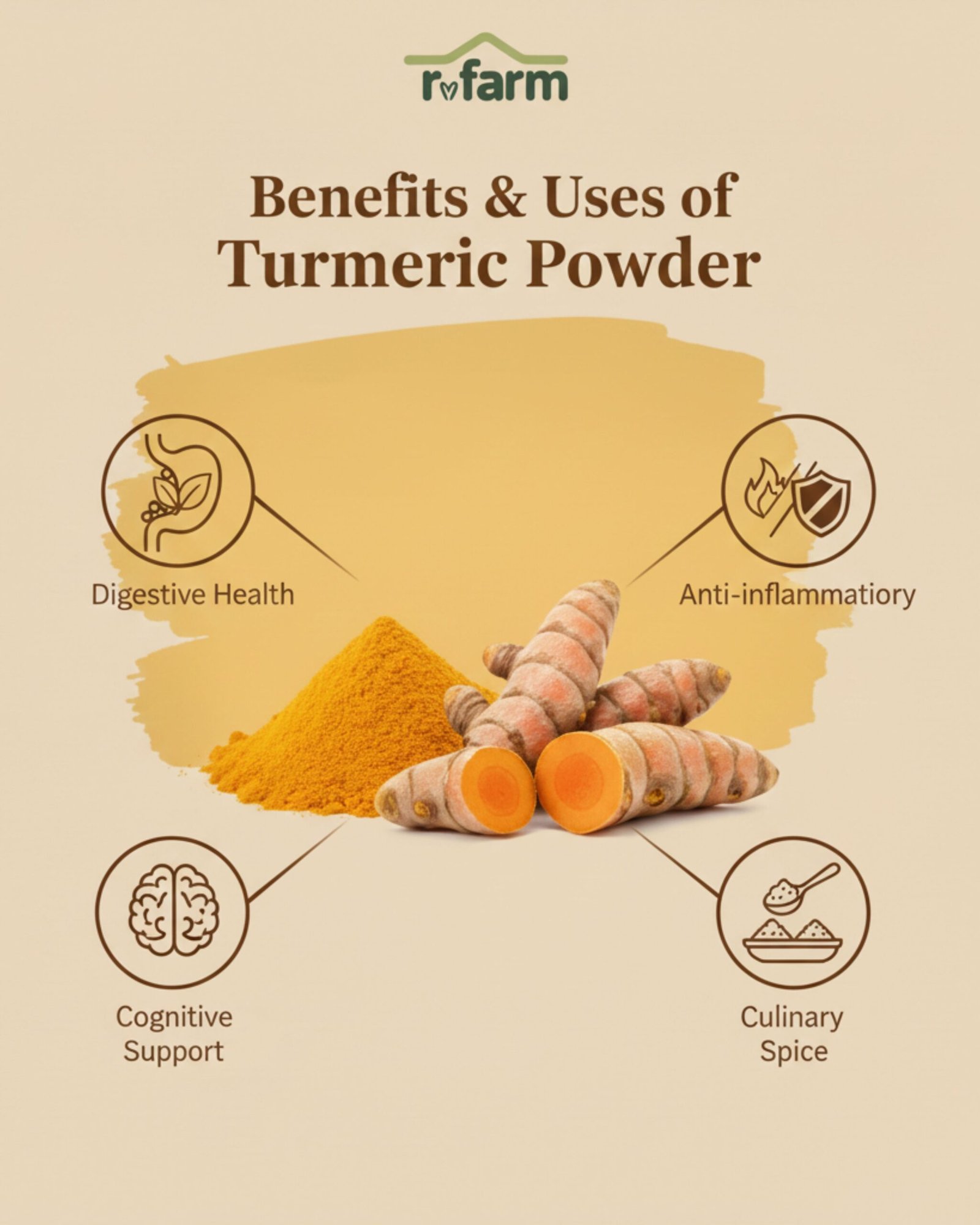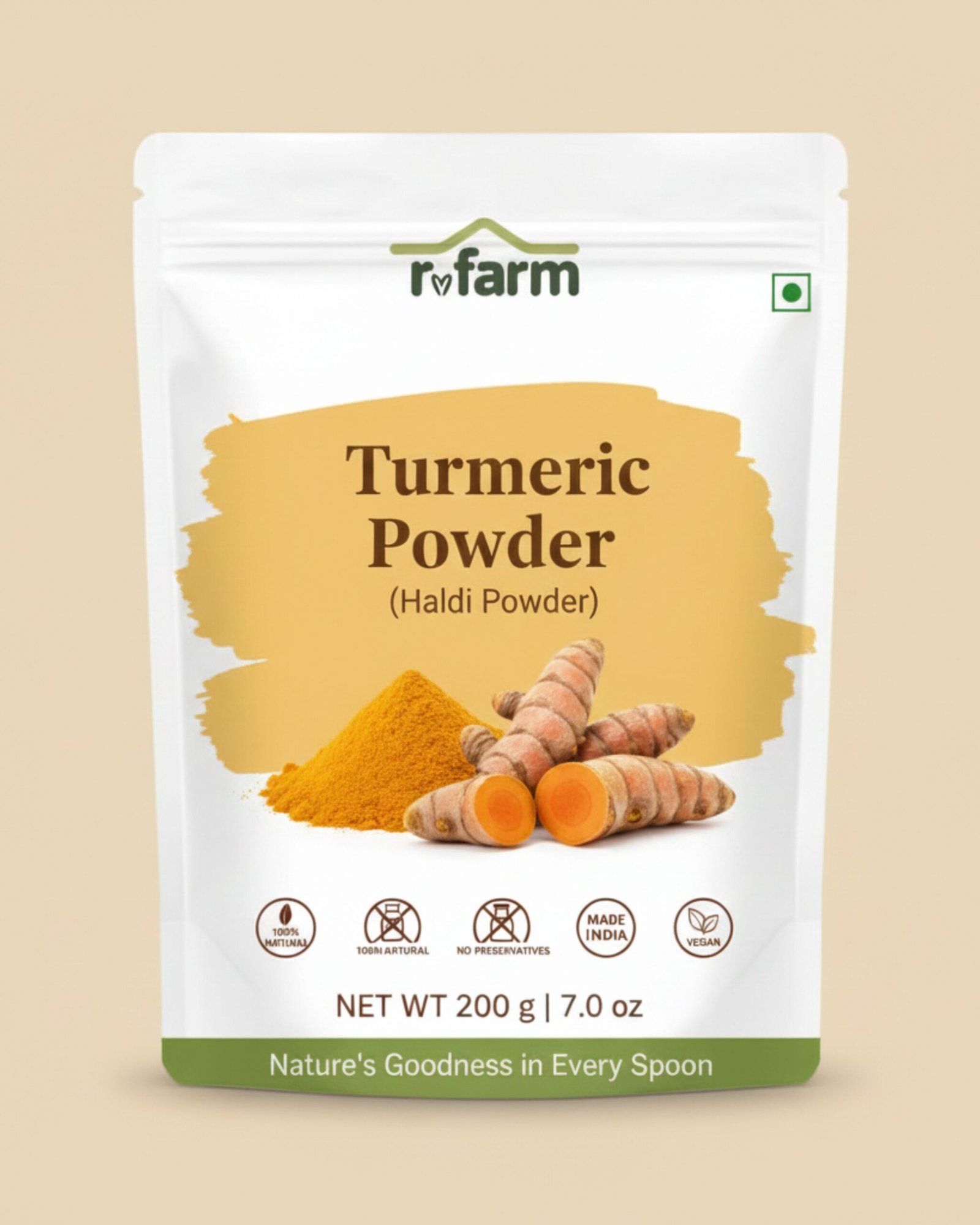 RVFarm Turmeric Powder is crafted from carefully selected turmeric roots that are naturally grown and sun-dried to preserve their goodness. Using a traditional slow-grinding method, the turmeric is ground gently to retain its natural oils, rich golden colour, and earthy aroma. High in curcumin, this pure and unadulterated turmeric powder is known for its immunity-boosting, anti-inflammatory, and antioxidant properties. Free from artificial colours, preservatives, and chemicals, RVFarm Turmeric Powder is perfect for daily cooking, golden milk, kadha, and traditional remedies—bringing you authentic taste and wholesome wellness in every pinch.